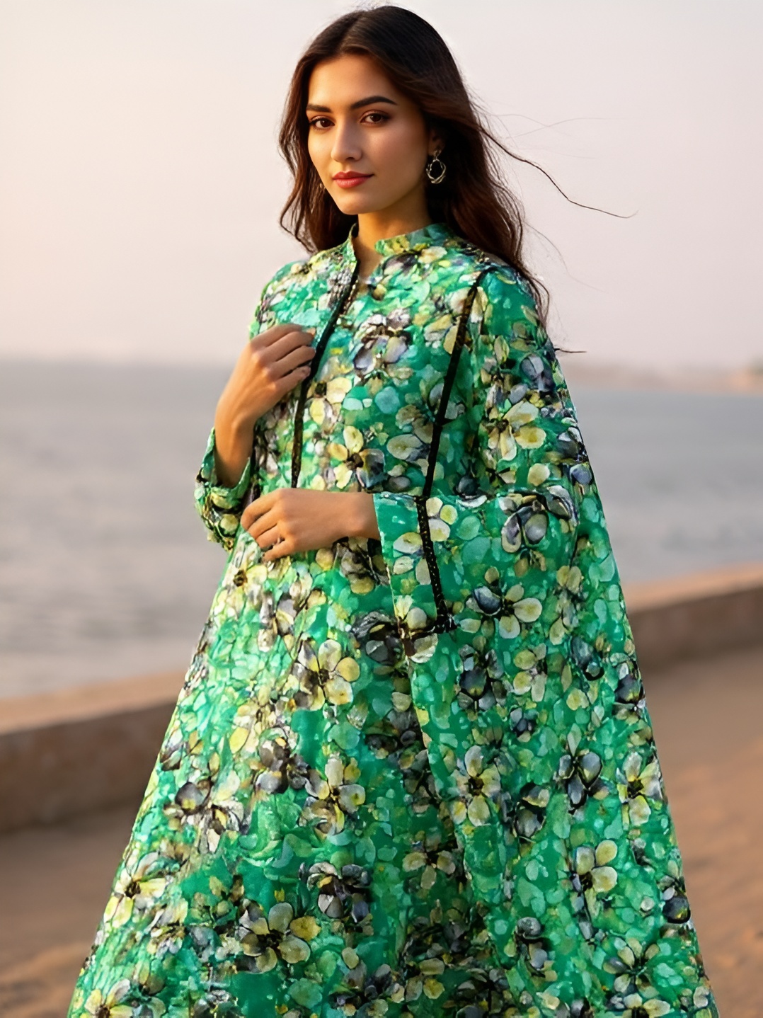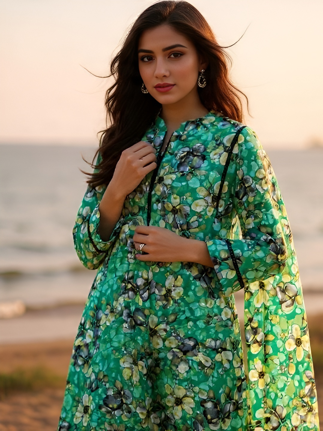 The Cut: Features a classic straight-cut tunic paired with wide-leg matching printed trousers (palazzos) for a relaxed yet polished silhouette.