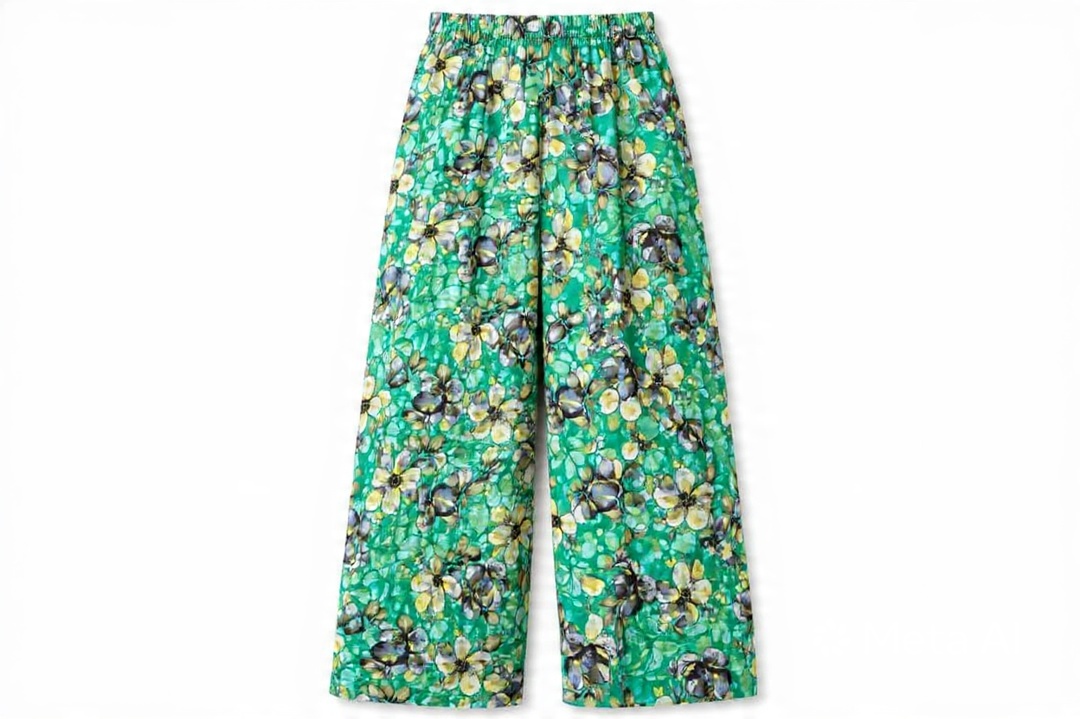 The Print: A vivid, leafy green base adorned with a dense, striking digital floral pattern in shades of ivory, charcoal, and chartreuse, creating a fresh, botanical look.